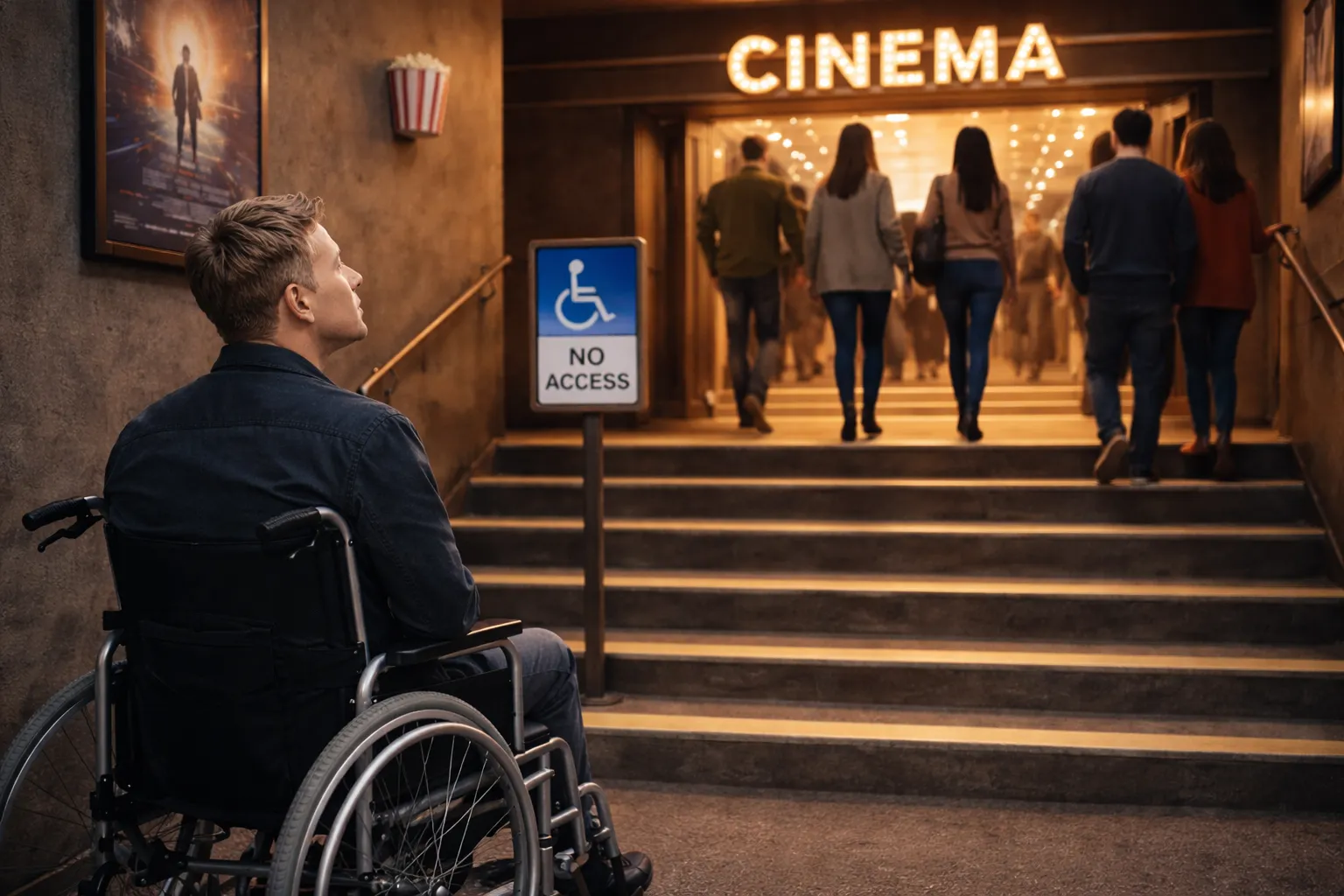 Wyobraź sobie sytuację, w której osoba poruszająca się na wózku przychodzi na seans filmowy do kina. Niestety, aby dostać się na salę kinową, trzeba pokonać kilka schodów. Kino nie ma rampy ani windy. Czy opisana sytuacja jest dyskryminacją? Tak – osoba poruszająca się na wózku nie ma w praktyce takiej samej możliwości skorzystania z oferty kulturalnej jak osoby, które poruszają się samodzielnie. To przykład dyskryminacji bezpośredniej, czyli takiej, w której gorsze traktowanie wynika z posiadania przez kogoś określonej cechy chronionej.